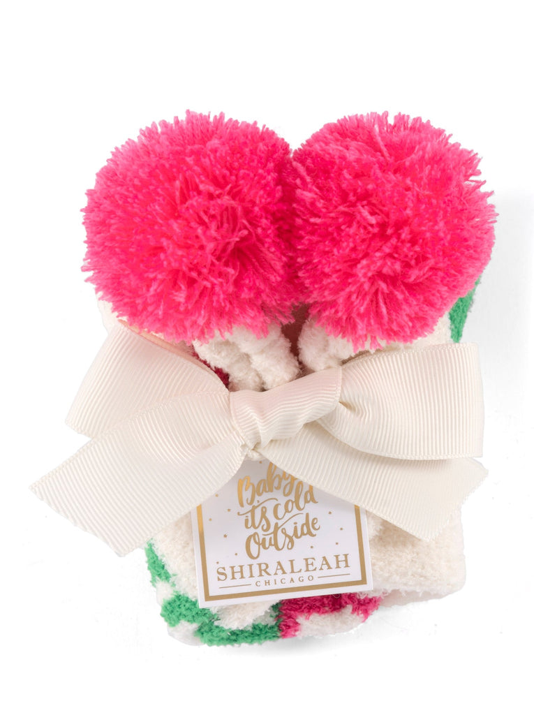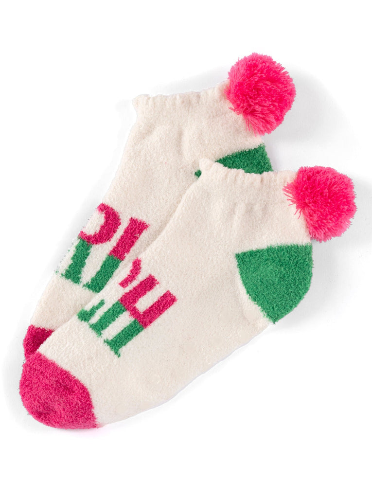 Fuzzy comfort meets polished style in Shiraleah’s "Grinch" Home Socks. These socks feature a fuzzy texture, pompom heel detail, and have a unique feminine flair with its fun and festive phrase "Grinch" in bold pink and green letters. The socks come in a ivory, pink and green color combination. These socks have a rubber grip bottom and are packaged ribbon wrapped making them the perfect gift option.
