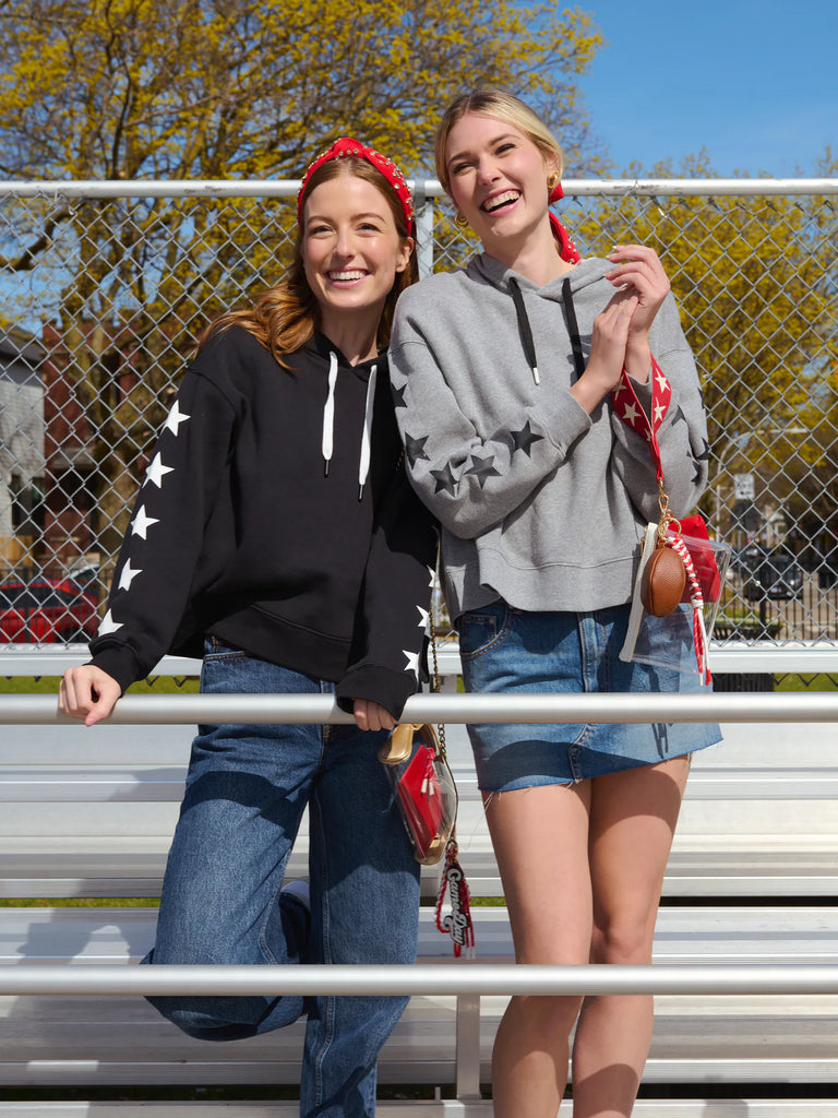 Show your team spirit in cozy-chic style with the Stars Relaxed Hoodie from Shiraleah's Gameday Collection. This laid-back essential features bold star graphics down both sleeves and contrasting drawstrings at the hood for a sporty edge. The relaxed fit and soft cotton blend fabric make it a game-winning choice whether you're cheering from the stands or your couch. Pair it with denim, skirts, or joggers for an effortlessly cool gameday look anywhere you go.